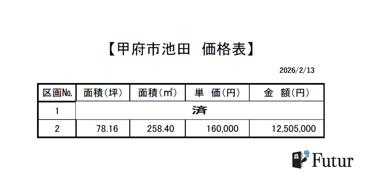 【分譲地】池田2丁目 No.1 済 No.2 78.16坪 12,505,000円★掲載中 ■学区■ ・池田小学校 徒歩10分 ・西中学校 徒歩26分 建築条件なし★ お問合せは【(株)Futur 055-225-3557】へお気軽にご連絡ください♪ もっと見る 土地 お問い合わせ 資料請求 お問い合わせ 価格 1,251万円(税込) 所在地山梨県甲府市池田2丁目 面積258m2 建ぺい率60% 容積率200% 地目宅地 取引形態代理 株式会社 Futur お問い合わせ 企業情報を確認 失敗しないシタク