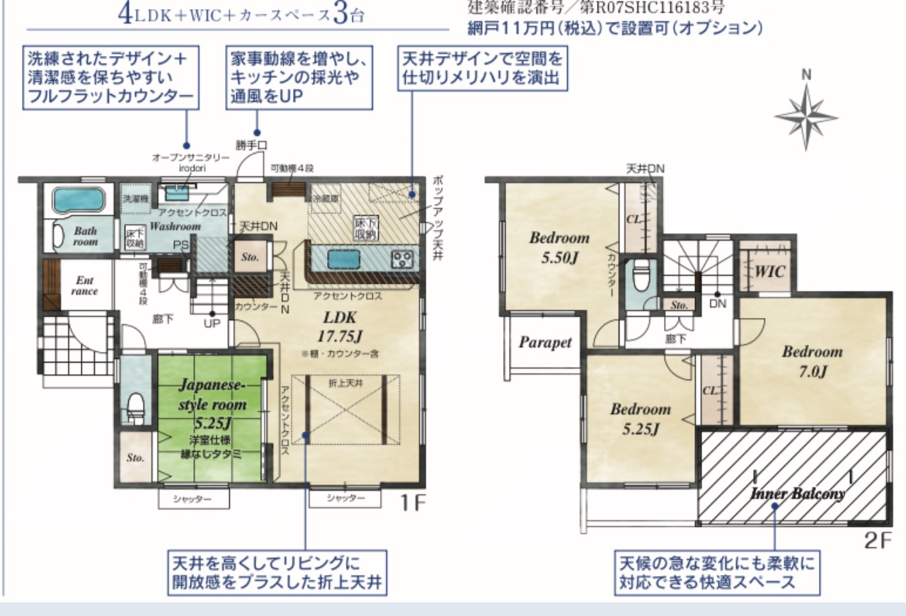 寝室には収納付きですので収納たっぷりと!「住宅性能評価」を「設計」と「建設」で全棟取得!設計性能評価と、現場での厳しい社内チェックに加え、国が認めた第三者機関の評価員が4回の検査を1棟1棟厳密にチェック。4回の現場検査をクリアした建設性能評価を取得している住宅だからこそ、安心へのこだわりが違います!こだわりの設備仕様(IH+食洗器+LED照明+浴室換気乾燥暖房付)耐震等級3取得に長期優良住宅取得!網戸オプション設置可能(11万円税込み)